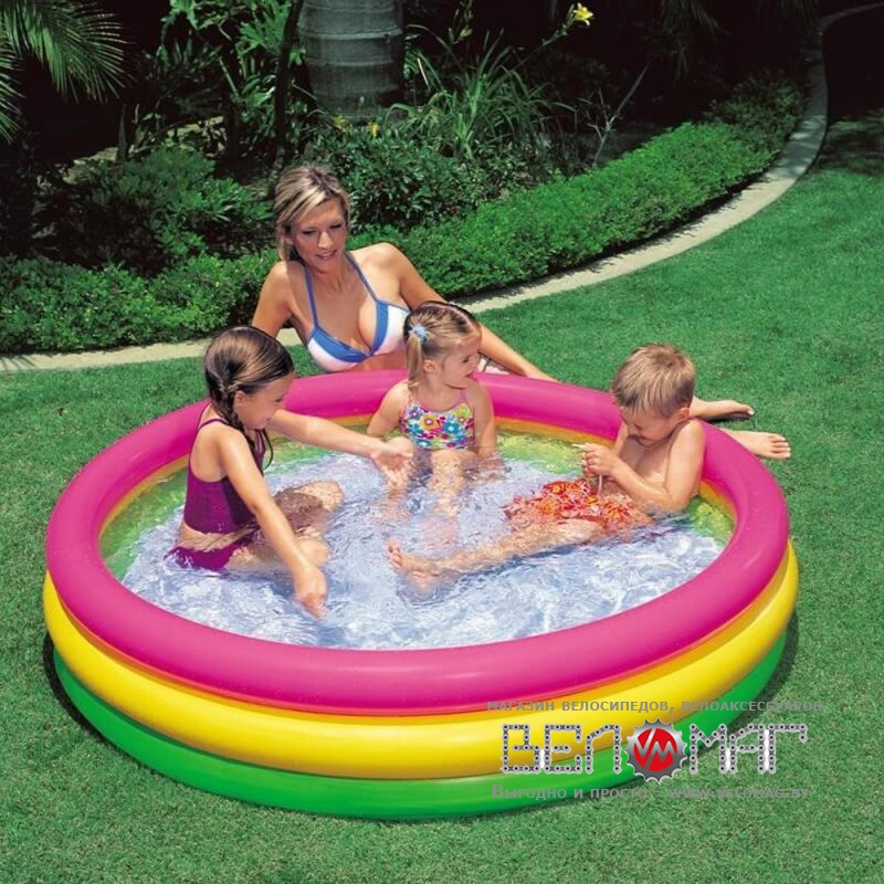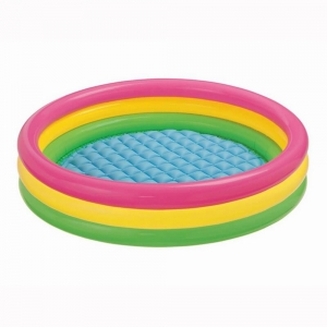 Яркий и красивый надувной бассейн Intex 57412 «Радуга» предназначен для детей от 2 лет. Он имеет 3 разноцветных кольца, выполняющих функцию бортиков (из-за чего и получил свое название) и водоотвод для быстрого спуска воды, расположенный в днище.