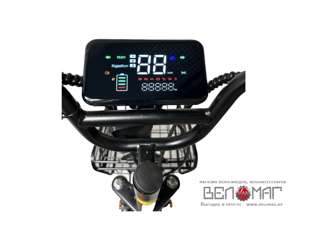 Электровелосипед Kirin V3 Pro Plus удобен в управлении — все основные функции расположены на руле под большими пальцами: звуковой сигнал, включение освещения и поворотников, переключения скорости и привода. На большом цветном дисплее отображается скорость, пробег, заряд аккумулятора, также индикаторы включенного освещения и поворотников.