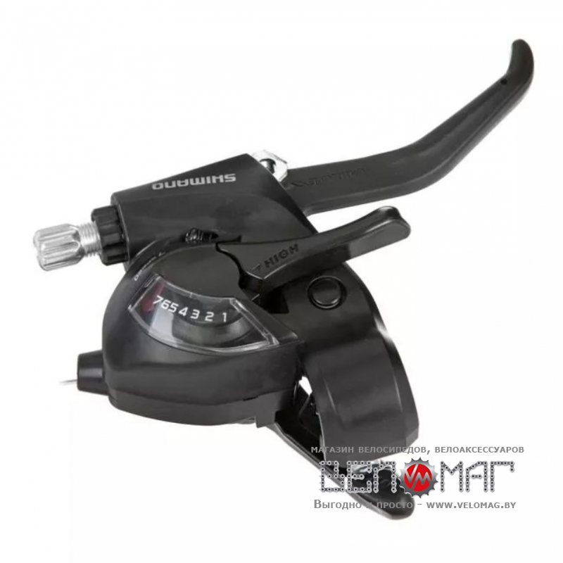 Качественный моноблок от известной японской компании Shimano, сочетающий в себе триггерный шифтер для 7-скоростного переключателя и тормозную ручку. Натяжение троса осуществляется большим пальцем, сброс - указательным. Относится к линейке комплектующих Tourney, предназначенных для установки на недорогие велосипеды начального уровня. Материал - пластик/алюминий. Цвет: черный