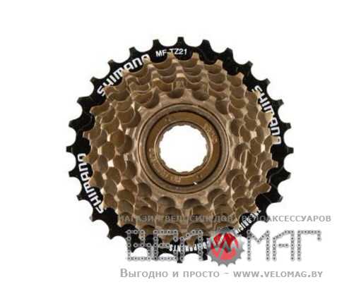 Трещотка MF-TZ21 от японской компании Shimano представляет собой набор из 7 ведомых звездочек, присоединяемых к втулке заднего колеса с помощью резьбы. Данная модель предназначена для установки на велосипеды начального уровня. Для увеличения срока службы трещотки следует своевременно менять цепь и периодически обновлять машинное масло в подшипниках втулки. Для установки и демонтажа трещотки применяется специальный шлицевой ключ.